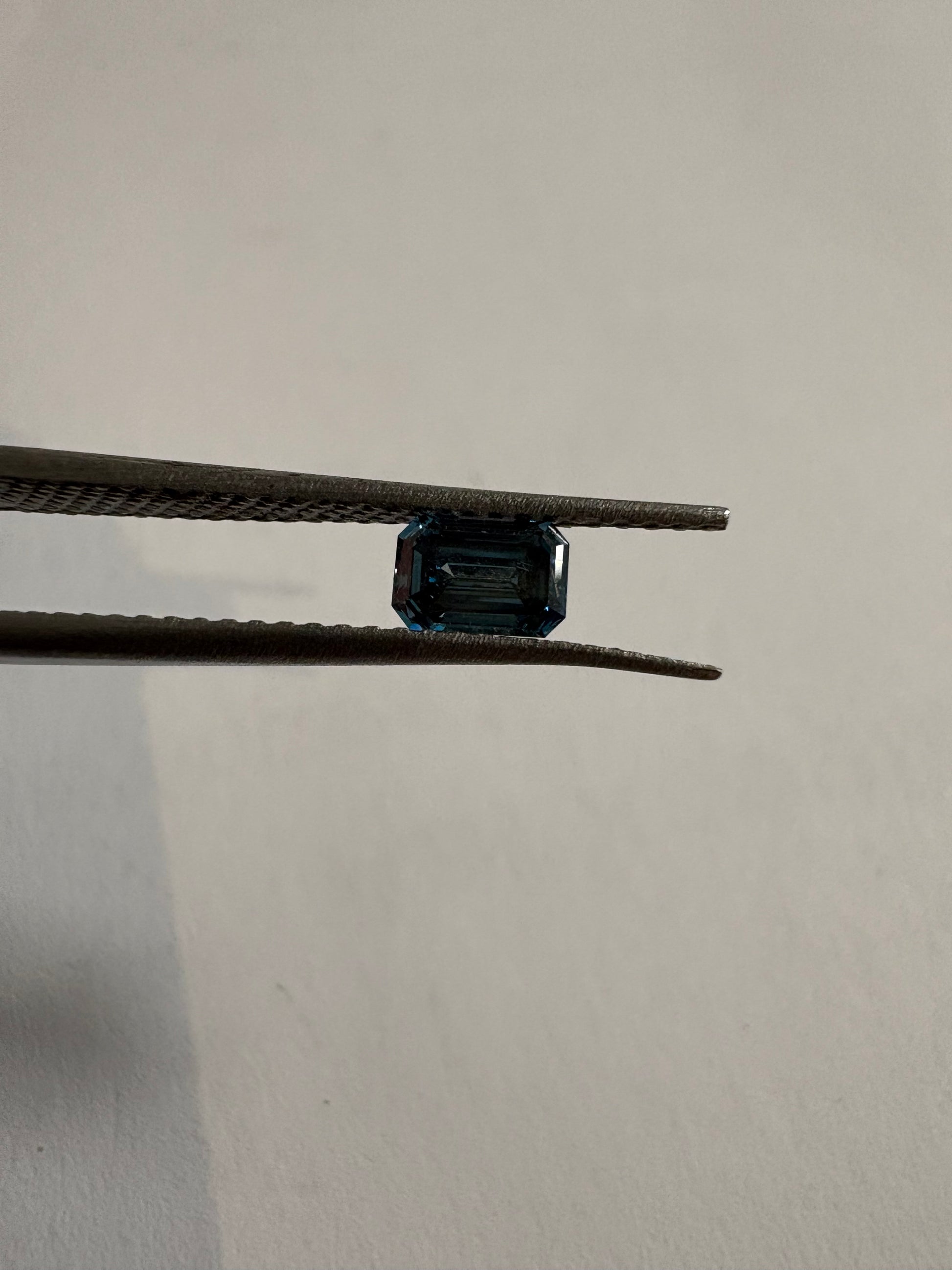 This exquisite emerald-cut sapphire measures 4.86 × 3.32 × 2.11 mm and weighs 0.22 carats. It showcases a fancy deep blue color with VS2 clarity, offering rich color and excellent transparency.