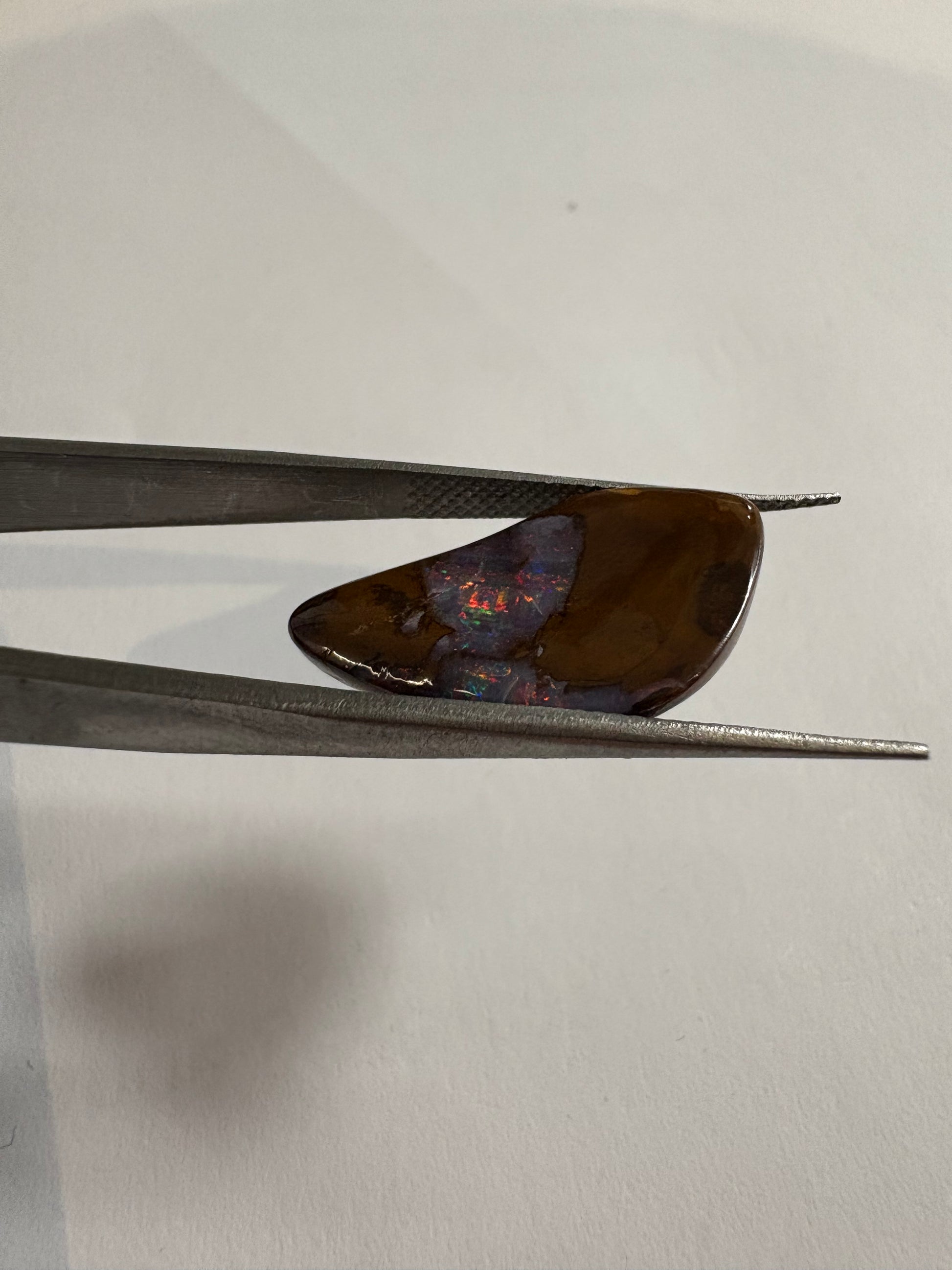 This striking boulder opal weighs 8.80 carats and showcases a vibrant play of colors with flashes of blue, green, red, and gold dancing across its natural ironstone matrix. The unique combination of bright opal and earthy matrix gives this gemstone character, depth, and undeniable beauty.