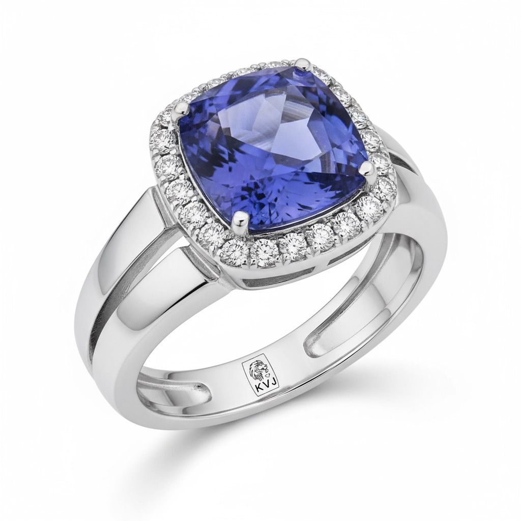 Presenting the “Blue Prism” ring: a cutting-edge creation in 18K white gold, centered around a vivid blue cushion-cut tanzanite (0.59ct). The exceptional tanzanite, sourced ethically and heated for brilliance, displays mesmerizing blue-violet hues that transform with every movement. Encircled by a brilliant halo of natural diamonds, this design radiates modern luxury and refined grace.