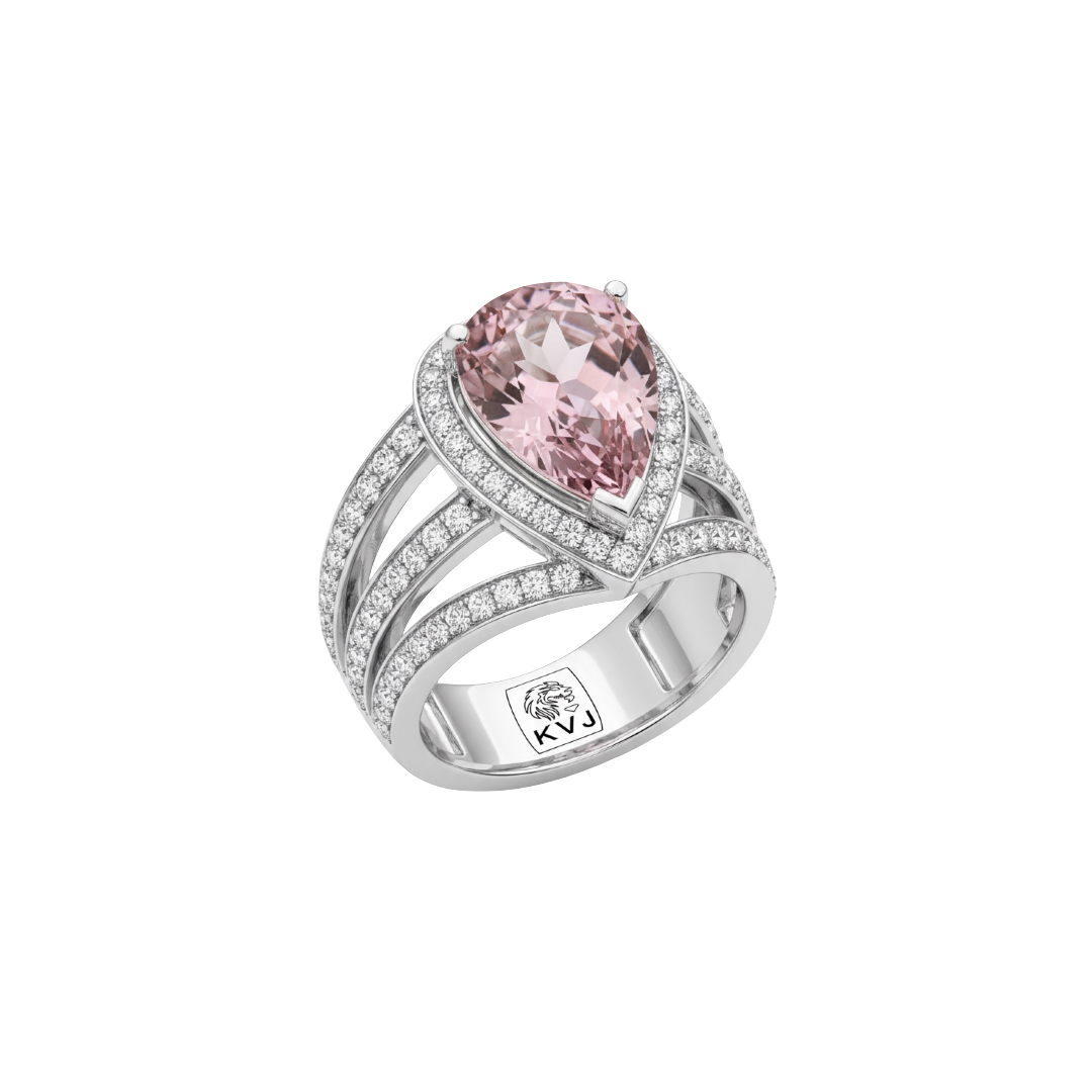 Experience pure elegance with the “Celestial Aurora” ring: a spectacular futuristic piece crafted from 18k Gold and set with a 2.75ct high-quality natural morganite in an eye-catching pear cut. The central morganite radiates a mesmerizing pink glow and is beautifully surrounded by a halo of natural diamonds, creating a perfect harmony of romance and modern sophistication.